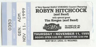 Here’s where I have to apologize to my wife. You see, this concert was on the same night as the concert Joe Strummer was performing at another Minneapolis club, The Quest. Amy had won tickets to that show! But did we go to see Joe Strummer play? Nooooo. No, I had bought the Robyn Hitchcock tickets and I was the man, so we had to miss Joe. Even though it would have been a wash or we could have sold the Hitchcock tickets to someone else. Typical male thing, eh girls?