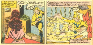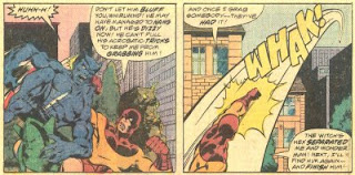 Just as that Whizzer sequence confused you, the sequence with Power Man punching Beast confused me. Byrne has crossed the axis, so that it makes me queasy trying to figure out if Power Man is punching Beast with the same hand he grabbed him with.