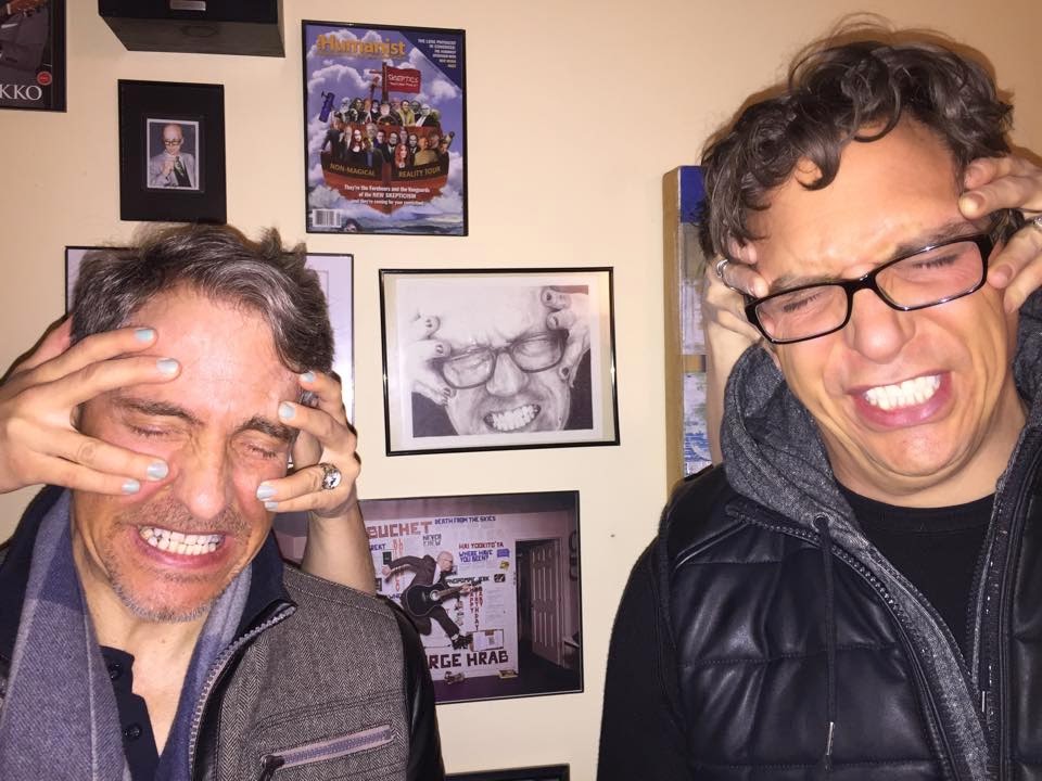 | Bob and Jay Novella and the portrait of Geo. Bob commented, “Before you think we’re crazy…look at the awesome pen-drawn image of Geo between me and Jay.” |