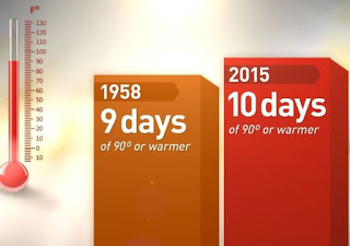 Yes, as the graphic tells us, Seattle has no record of ever having a summer with ten or more days with high temperatures of 90 or higher, until this year. But that is just one year. That’s weather. If the graphic had shown how there has been a steady increase in those hots days each summer in Seattle over the last ten, twenty years, that would be climate.
