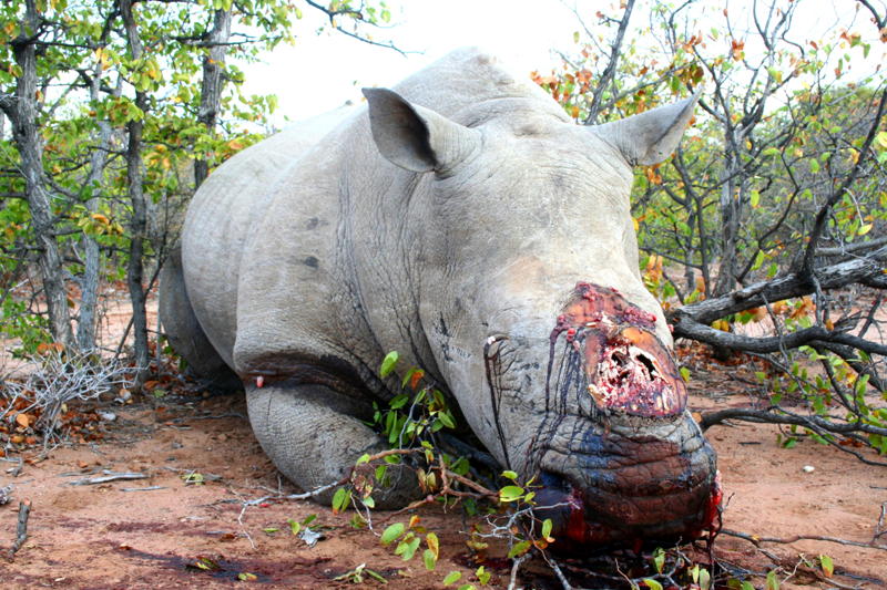 | This disgusts me. A poacher-slaughtered rhino with horn removed. |
