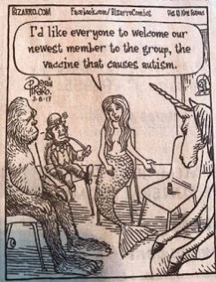 OK. There are no breast implants or hip displacement here. But there is a positive and correct message presented by cartoonist Dan Piraro. His March 8, 2017 edition of his daily strip Bizarro shows a group meeting of mythical beings. The newest member of the group is the vaccine that causes autism. Truly a mythical thing.