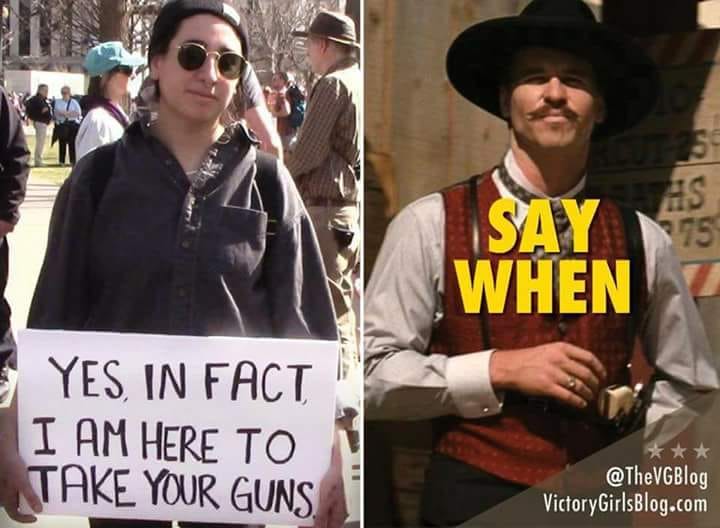 As you can see, the meme above is an anti-gun control message. The person who made it used a gun protestor’s admission of wanting to take guns away from law-abiding Americans to give their response. Their response was shown by using an image of Doc Holliday (Val Kilmer) from the film Tombstone. Sort of, “Oh, yeah? Well, just try and take ’em.”