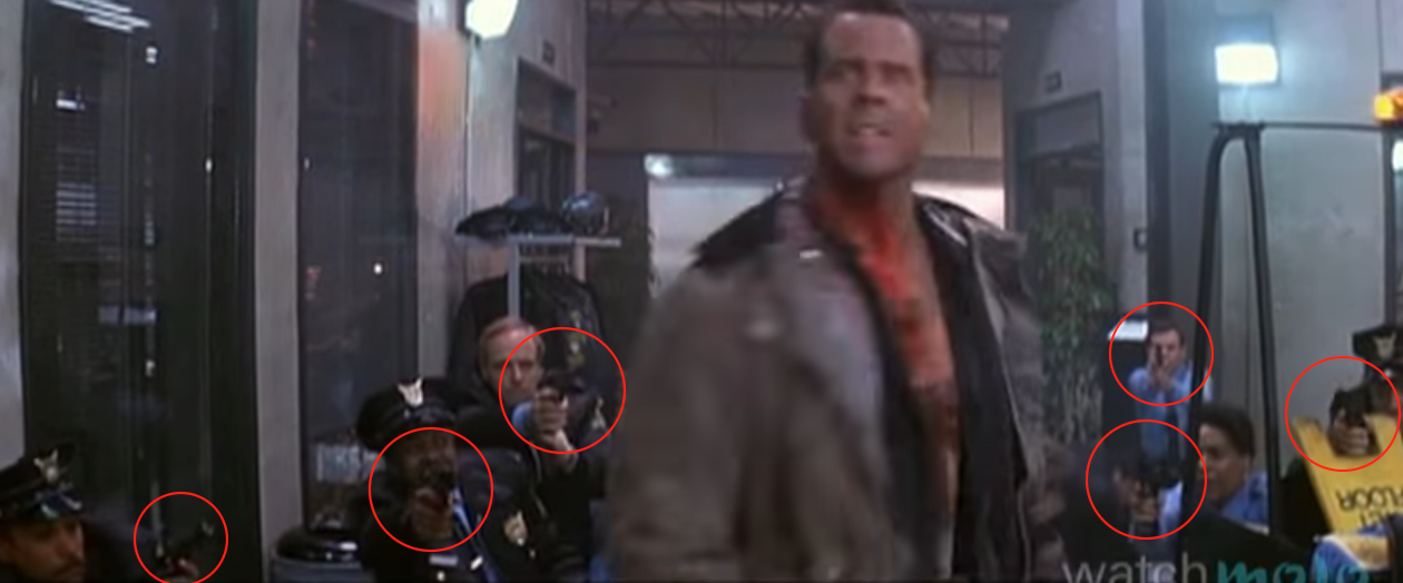 | A screen capture from seconds after McClane should be dead. Six cops with drawn weapons and not one of them took a shot. |