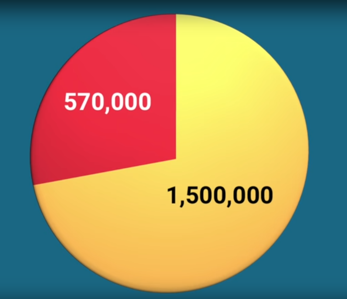 However, the person who created the animated graphics for the video doesn’t know how pie charts work. We are told a total 1.5 million women are affect by breast cancer worldwide each year. And we are also old that 570,000 women were killed by breast cancer in 2015. I would say that’s an effect. The 570k is part of the 1.5 million for 2015. We are shown the graphic below. Can you see the error?