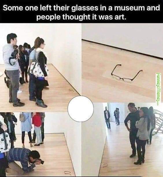 It is funny that these people appear to think a pair of eyeglasses is a piece of art. And it’s clear the intent of this meme is to make these art patrons look silly. It may also be a commentary on the state of art.
