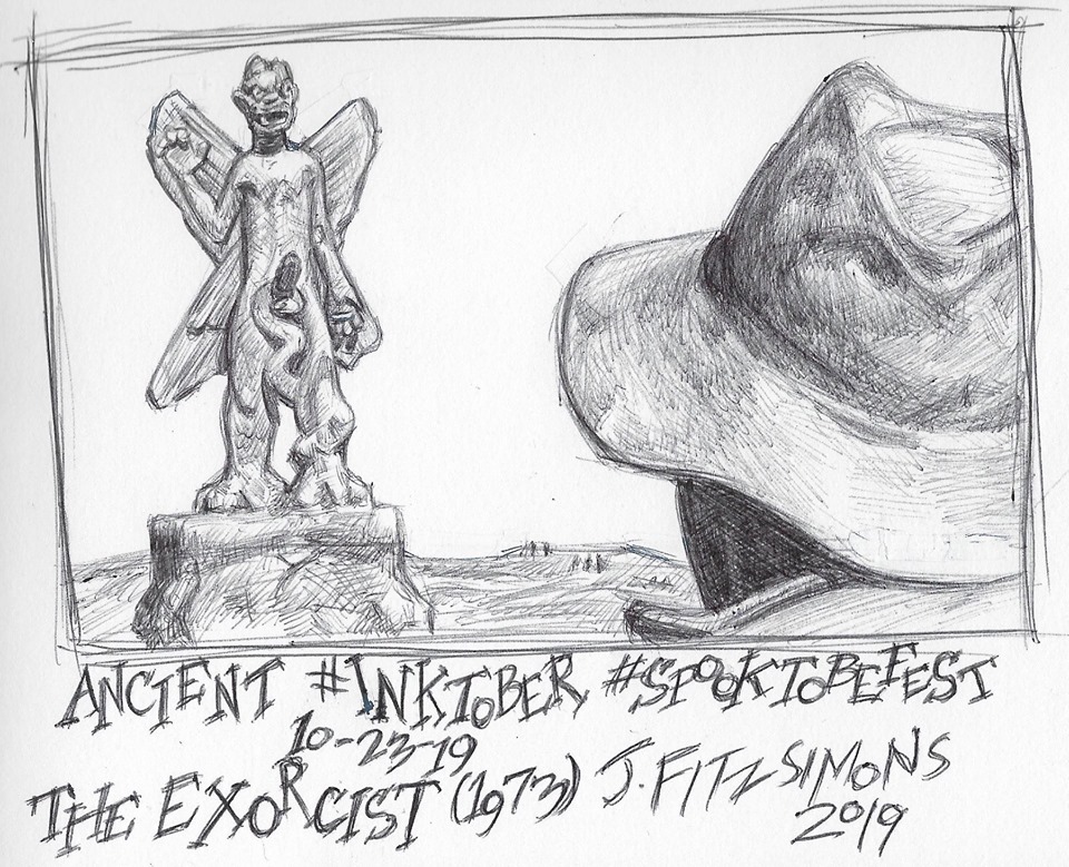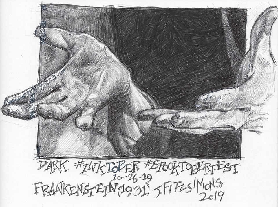 I mentioned a few of the drawings and I thought you might like to see them. There was the prompt Treasure for which I drew Robert Newton as Long John Silver. (I even recommended watching the 1950 Disney classic Treasure Island.) The prompt Ancient brought the film The Exorcist (1973) to mind, which gave me the opportunity to join some others of the Inktober group in drawing naughty bits. And there was the prompt Dark, which I think inspired my best drawing of the month. I drew the hands of Boris Karloff as the monster in the Universal horror classic Frankenstein (1931).