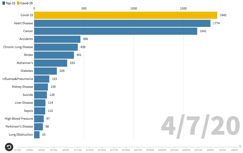 There is one caveat remarking the gif. I would like there to have been source citations for the information presented in the chart. The big number (1,842) given for the one day death toll for COVID-19 does sound about right, but I couldn’t confirm it. I did do some math with the daily average death number caused by Influenza/Pneumonia (153) and it seems accurate to me.