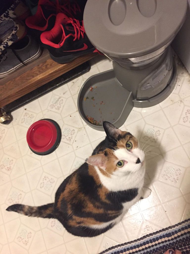 Amy decided it was time for a vet visit. Hoo boy! That means a vet bill (another reason to not have pets). The vet told us to get an automatic pet feeder. Which we did and I must say it has helped.