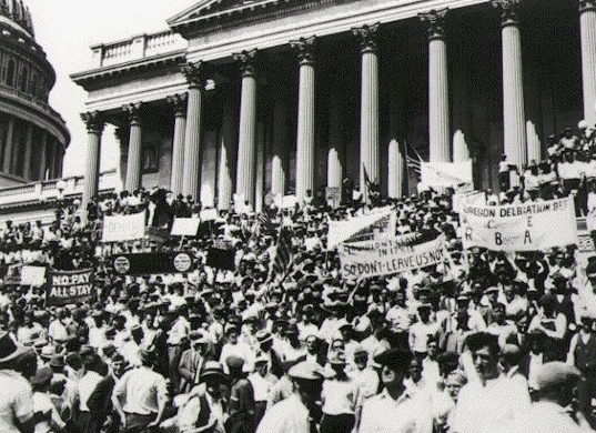 It was the Bonus Army. This “army” was made up of thousands of WW1 veterans who had been hard hit by the Great Depression. The American government had granted the veterans a “bonus” to be paid to them in 1945, however the veterans needed the money desperately in 1932. They went to Washington DC to protest to get that money immediately.