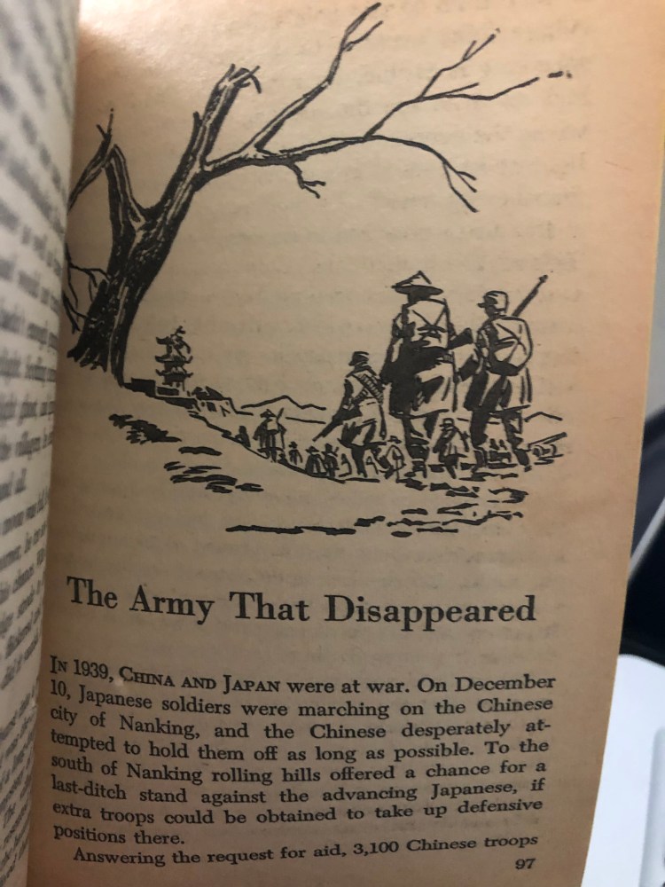 I went back into the pages of Strangely Enough to see what I could find about another of my favorite stories. In December, 1939 (or 1937 depending on the source), in China during the Second Sino-Japanese War (1937-1945) 2,988 Chinese soldiers (known as the Nanking Battalion) completely disappeared.