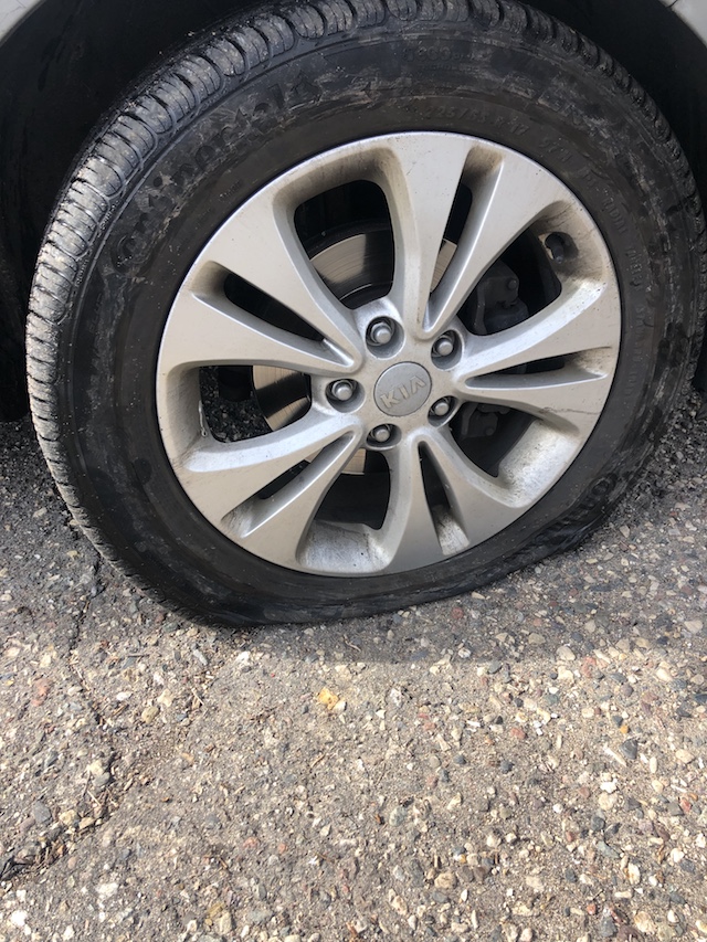 Two weeks ago, on Wednesday, the Kia Soul went and got itself a flat tire. The car didn’t come with a spare, but it did have a kit (see the pictures above). I put the kit to use and got some air in there. It held air long enough for me to get to the tire store and get it repaired. For free!