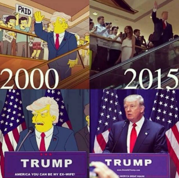 It’s been spreading around the internets and at first is is stunning how similar a segment of an episode of The Simpsons from 2000 is to the Orange Fascist’s announcement of his intention to run for President destroy America in 2015.