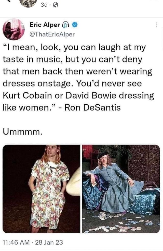 DeSantis is a horrible asshole, who wants to scare his voters about the Dems coming for their gas stoves and forcing they kids to all be trans and teaching them to hate America by not literally whitewashing history. But his saying Kurt Cobain and David Bowie never wore dresses…