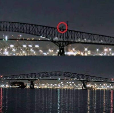 Soon after the tragedy of the Francis Scott Key Bridge collapse, the image showed up on my Facebook. The suggestion is that that blobsquatch in the circle is the Mothman, except there has been a little doctoring of the image.