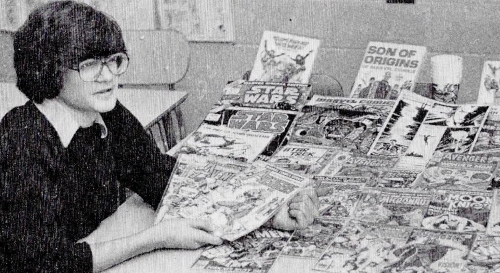 I decided to give it a try. There is a picture of me in my 1980-81 class yearbook, in which I am posing with a selection of my comic books and some related items. I was about 16 in the photo. I painstakingly attempted to be as accurate as possible in the reproduction, however a few items are missing in the updated image: The original art page, a Slurpee cup, and my hair helmet. Where did that hair helmet get to?