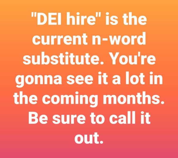 The whole point of the DEI hire dog whistle is to allow racists, misogynists, and MAGAs to say Kamala Harris isn’t white and isn’t a man, without actually saying those things. And going deeper, I think it’s their winking way to say the N-word to their like-minded cohorts.